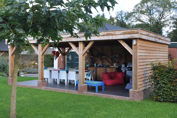 Het tuinhuis is gebouwd op een betonnen ondergrond die is afgewerkt met tegels van 60 × 60 cm. Met een opening aan twee kanten naar de tuin heeft het tuinhuis een erg open karakter en dat maakt de overgang tussen tuin en tuinhuis een heel natuurlijke.