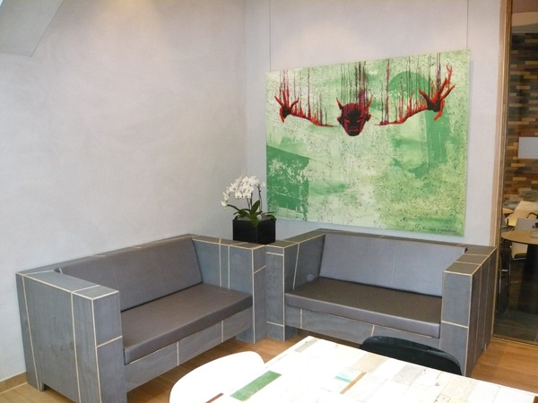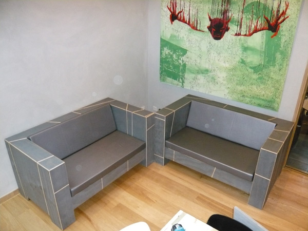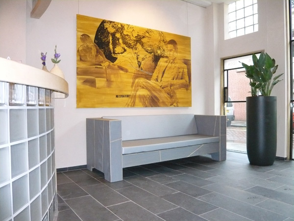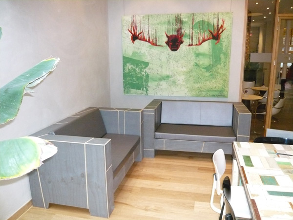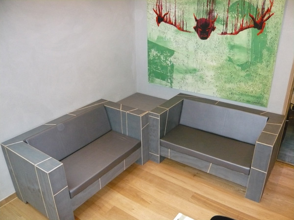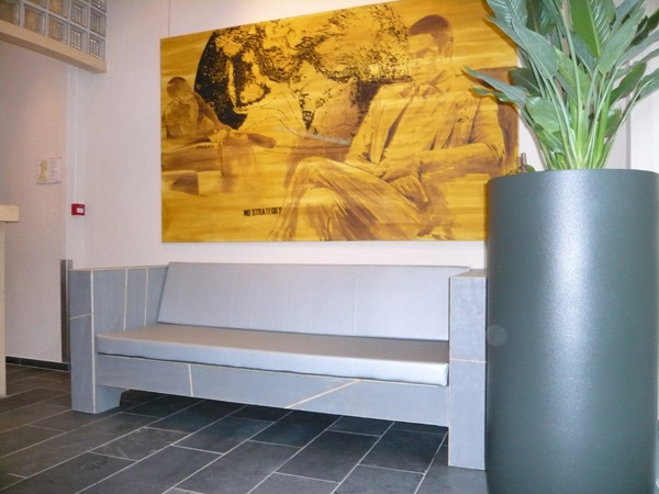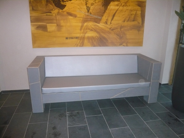 Zitbanken op maat gemaakt en passend in de stijl van het interieur van Hotel Asgard. Volledig natuurvriendelijk verbouwd/gerenoveerd en met natuurlijke producten zoals hout leem en zeewier.