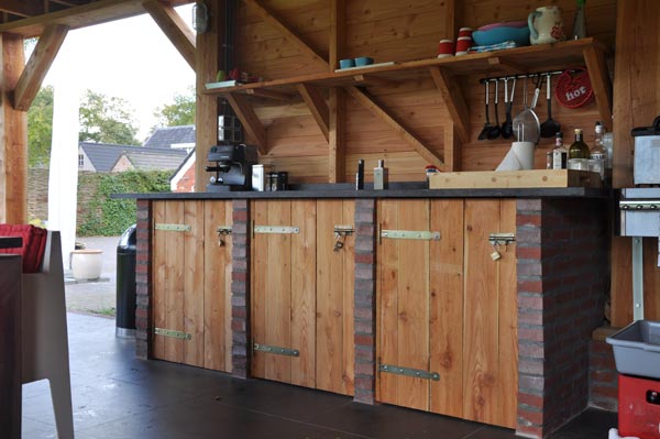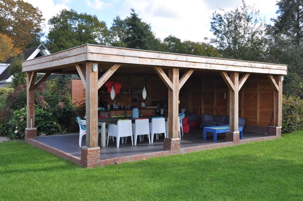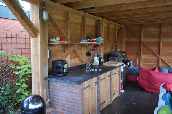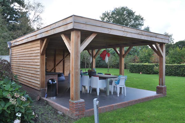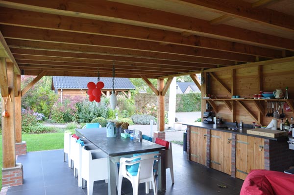 Het tuinhuis is gebouwd op een betonnen ondergrond die is afgewerkt met tegels van 60 × 60 cm. Met een opening aan twee kanten naar de tuin heeft het tuinhuis een erg open karakter en dat maakt de overgang tussen tuin en tuinhuis een heel natuurlijke.